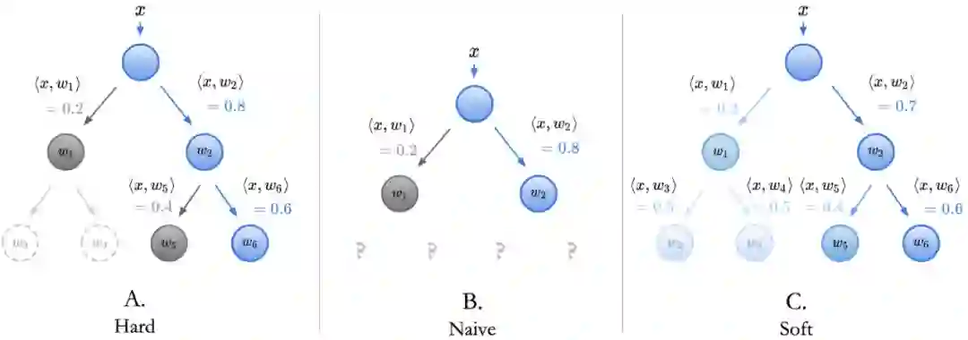 简单决策树(naive decision tree):研究者构建了一个每一类仅包含一个根节点与一个叶节点的基本决策树,如上图中「B—Naive」所示。每个叶节点均直接与根节点相连,并且具有一个表征向量(来自 W 的行向量)。