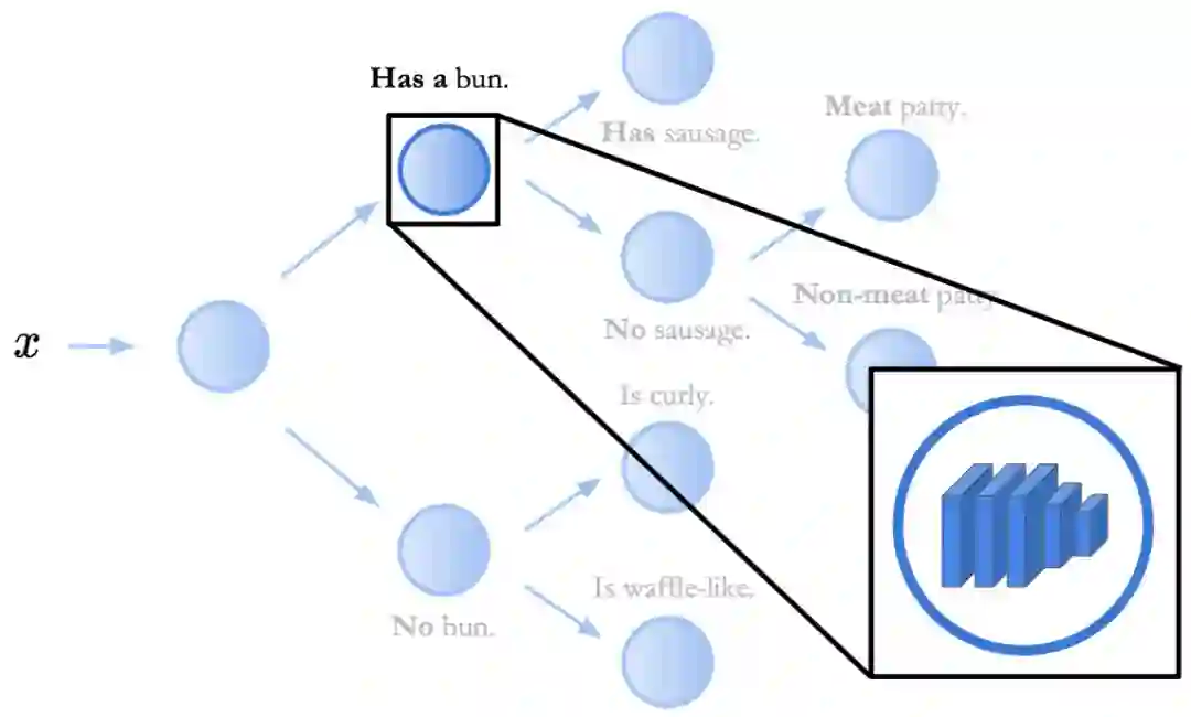在这张图中,每一个节点都包含一个神经网络,上图放大标记出了一个这样的节点与其包含的神经网络。在这个 NBDT 中,预测是通过决策树进行的,保留高层次的可解释性。但决策树上的每个节点都有一个用来做低层次决策的神经网络,比如上图的神经网络做出的低层决策是「有香肠」或者「没有香肠」。