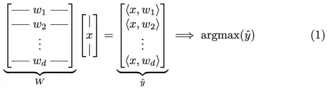 以上产生了一个矩阵-向量乘法,之后变为一个向量的内积,这里将其表示为$\hat{y}$。以上输出最大值的索引即为对类别的预测。