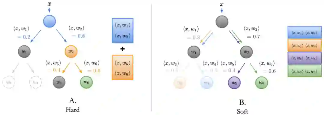 使用从样本提取的特征 x 进行推断意味着,计算 x 与每个子节点表征向量的内积。类似于全连接层,最大内积的索引即为所预测的类别。