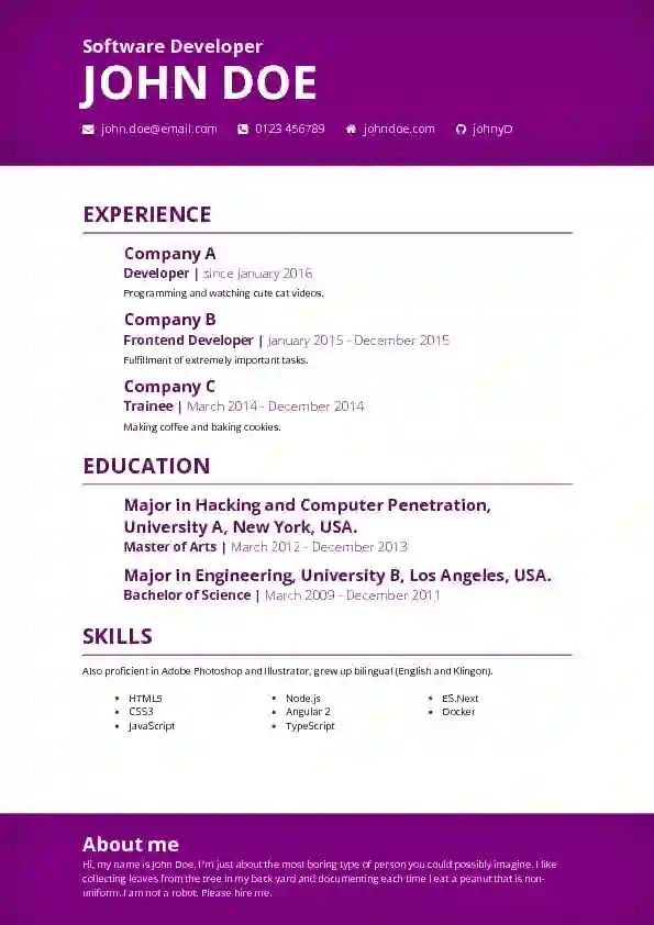 中国程序员简历模板,包括 PHP 、iOS、Android、Web 前端、Java、C/C++、NodeJS、架构师以及通用程序员简历模板。