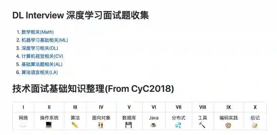 近日,有人在 GitHub 上开源了一个名为“Awesome Interview”的技术面试集锦,前端、后端、算法、客户端、语言、简历制作、面试经验等各种技术人面试需要的资料一应俱全。本文整理了与人工智能紧密相关的资源内容,希望对正在或计划参加 AI 技术岗面试的朋友们有所帮助。