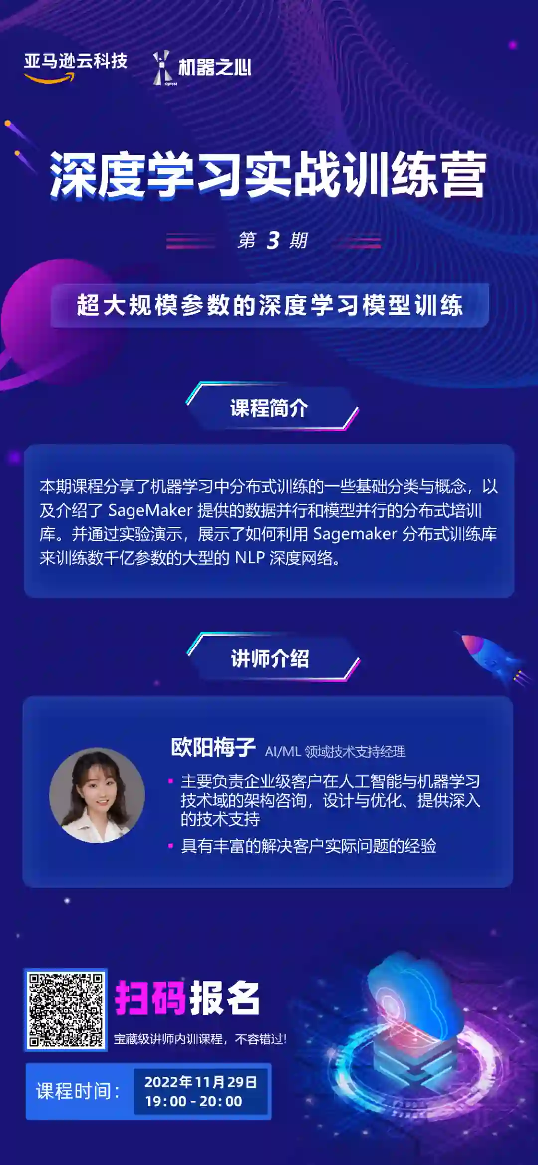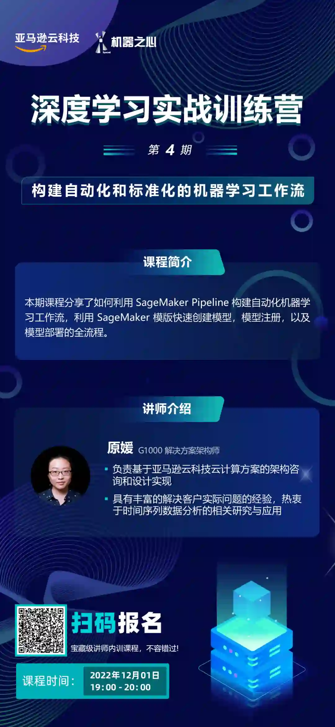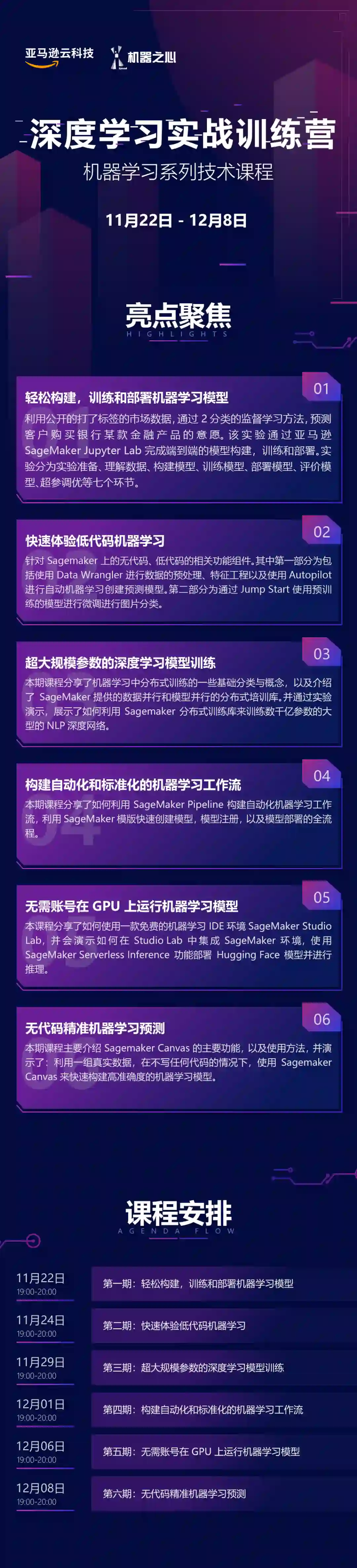 为了帮助开发者快速提升实战能力,机器之心联合亚马逊云科技开设了《深度学习实战训练营》线上实战营。实战营为期3周,共6次课程,还有6次课后作业,实战营期间讲师将在答疑群中随时解决同学的疑问,全程免费,欢迎希望上手实操深度学习的同学加入学习。