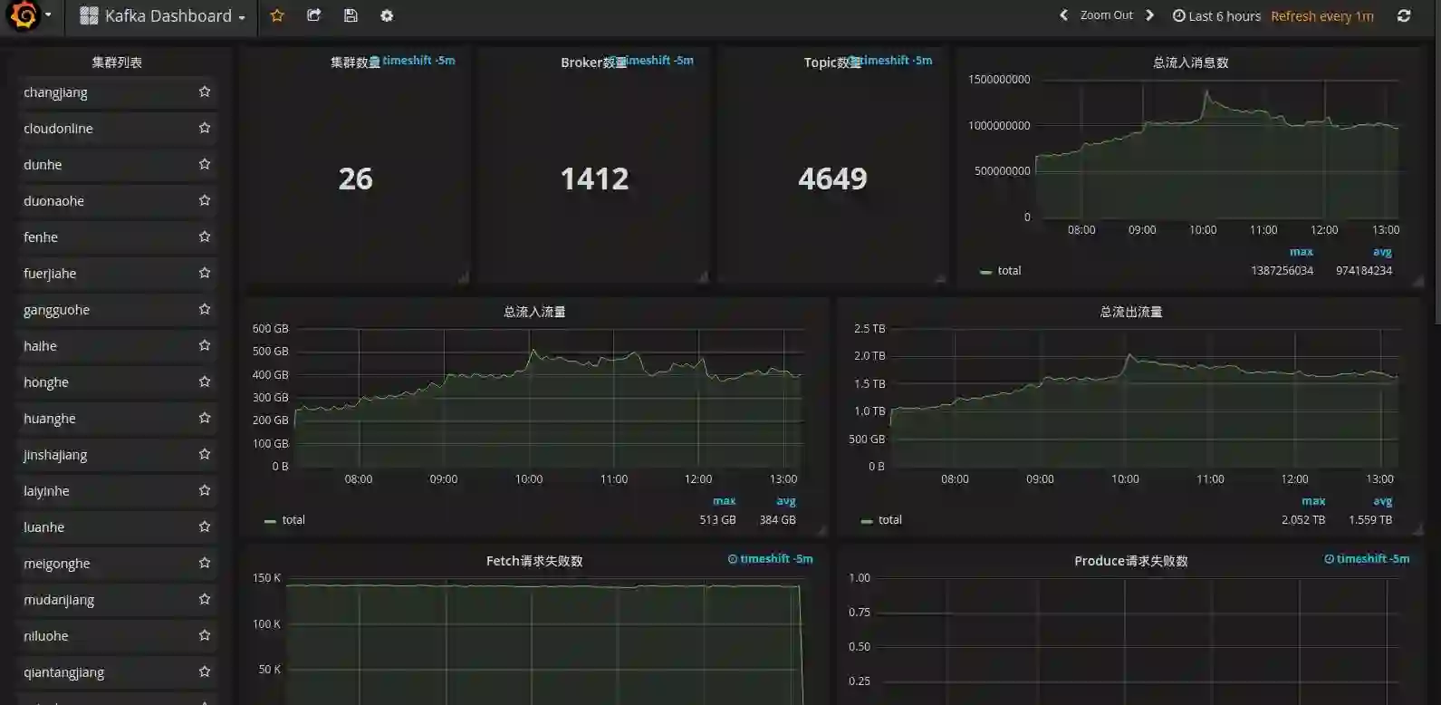 平台能够健康稳定的一个重要因素就是一个精准的监控系统,各个环节以及硬件等各种指标的采集分析都能够帮助平台进行自我检查和恢复。JDQ监控系统会采集服务端,客户端等各项指标进行梳理展示,帮助大家分析问题,也会根据这些指标进行一定的分析,得到现有系统的一个负载状况,当出现一些问题的时候可以进行自我修复。我们利用kafka的生态,用kafka connect进行数据采集,将服务端的metrics采集,然后利用kakfa steam进行一次数据的逻辑处理,再用kafka connect转存数据入ES,最终在grafana进行展示。