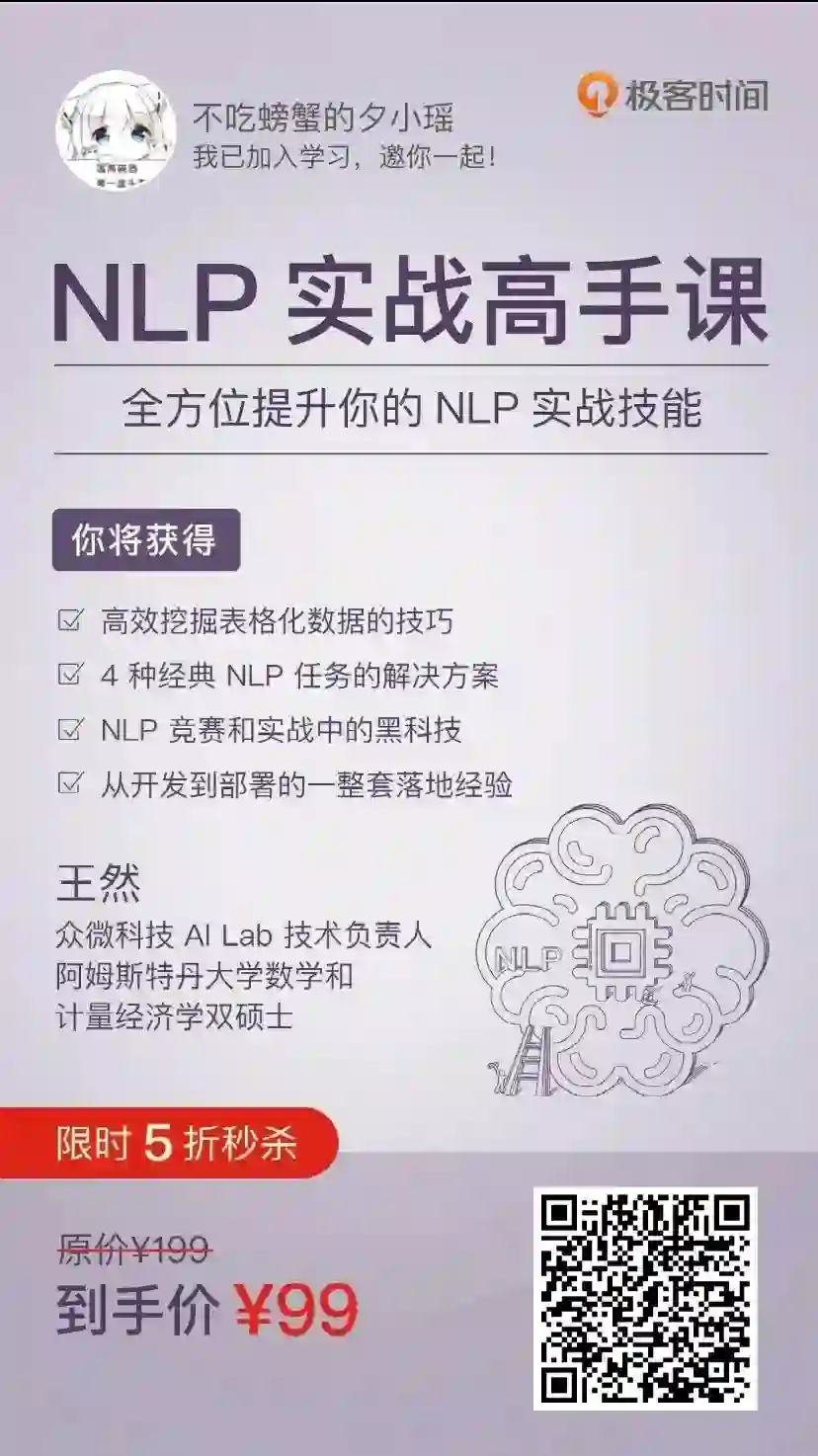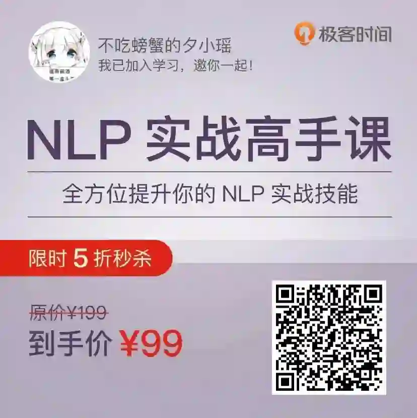 NLP 领域发展非常迅速,很多知识都在不断更新迭代。所以,其学习的方法就显得尤其重要。推荐极客时间的视频课《NLP 实战高手课》,我自己也在学习。这个课程可以带你掌握高效挖掘表格化数据的技巧,学会经典 NLP 任务的解决方案,并且通过几个实战案例,让你获得一整套从开发到部署的落地经验,全方位提升你的 NLP 实战技能。最近在做 5 折限时秒杀,160 讲的视频课,到手仅 ¥99。机会太难得了,抓紧时间上车。
