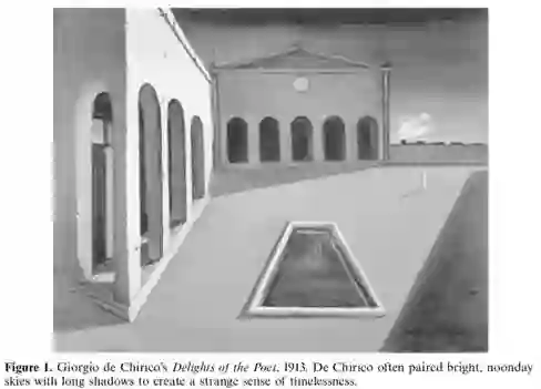 值得指出的是,阴影如此有用,可将全部阴影类型均用于绘画艺术的却并不多。在绘画中,用得最广泛的是材料本身形成的阴影。而能反映物体运动和时间变化的全影(Cast shadow)则较少被使用。Jacobson和Werner曾分析了大量古代的绘画作品,发现有两幅表现这些变化的作品[7]。一幅是作者Giorgio de Chirico画的“正午的教堂”。作者用长长的阴影配合明亮、正午的天空来形成永恒 (timelessness)的感觉。一幅是作者Masaceio画的“耶酥门徒犹大的故事”。他将犹大走路时形成的阴影画成透明的,通过覆盖在路边信徒的身上来表达圣经中曾经描述过的神迹:犹大经过的地方,路边虔诚信徒的顽疾会不治而愈。