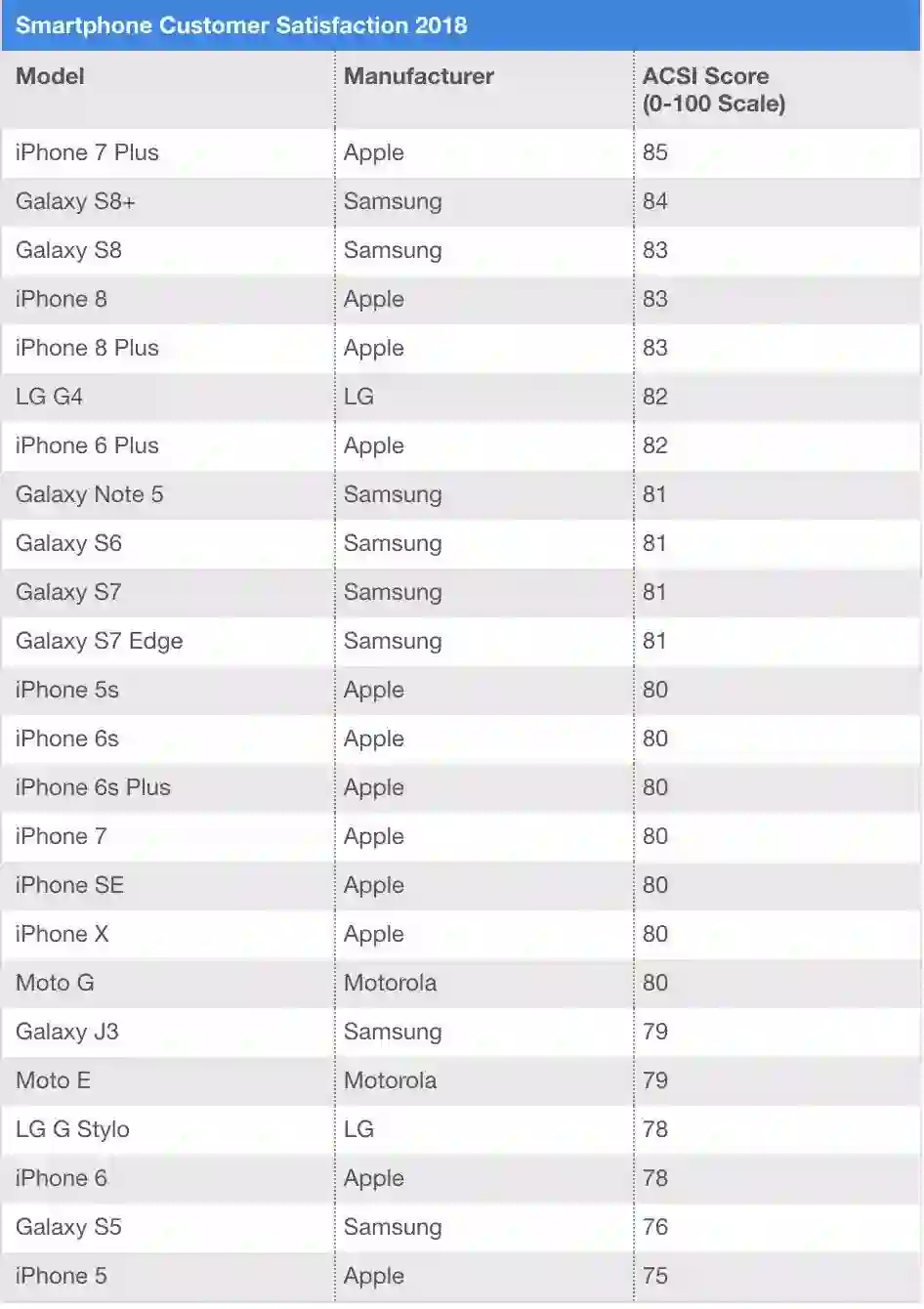 虽然iPhone X被消费者诟病稳定性不佳,还有Face ID的卖点,但iPhone XS呢?根据美国客户满意度指数(ACSI)发布的2018年智能手机报告,iPhone的客户满意度在下滑。最高分是iPhone 7P(85分),iPhone 8考分低了2分,到了iPhone X只有80分,和iPhone SE等机型持平。