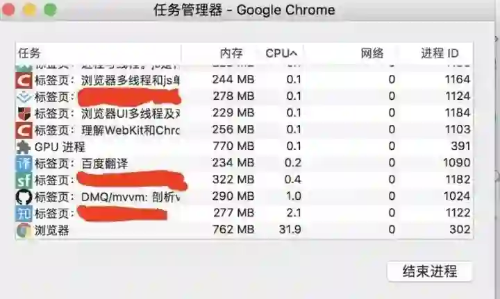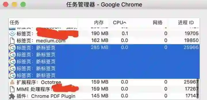 图中打开了Chrome浏览器的多个标签页,然后可以在Chrome的任务管理器中看到有多个进程(分别是每一个Tab页面有一个独立的进程,以及一个主进程)。