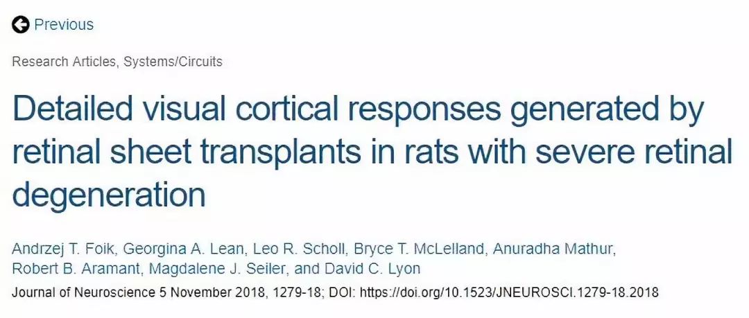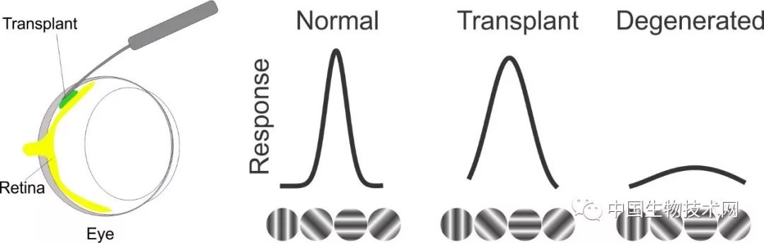 Lyon及其同事通过测量初级视觉皮层神经元的反应,证明了接受供体细胞的严重视网膜变性大鼠在术后三个月就对视觉刺激的各种属性变得敏感,包括大小、方向和对比度。