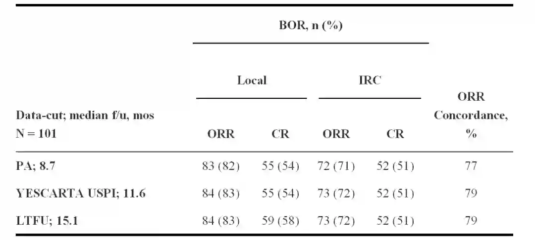 难治性大B 细胞淋巴瘤患者在低剂量环磷酰胺和氟达拉滨治疗后接受2×106细胞/每公斤体重CAR T细胞治疗(Neelapu & Locke et al. NEJM. 2017)。 最佳客观缓解率(BOR)由当地研究者和独立审查委员会评估(IRC; Cheson et al. J Clin Oncol. 2007); 一致性评价为IRC评估与研究者评估患者一致的百分比。