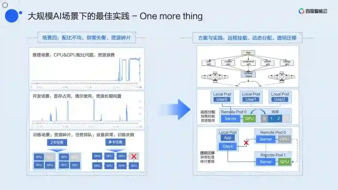 这里我再用三分钟左右的篇幅讲一下还在内部验证中的功能,这些功能将会近期完成在百度百舸平台的上线,进一步解决在大规模AI场景下常见的配比不均、供需失衡、资源碎片等问题。