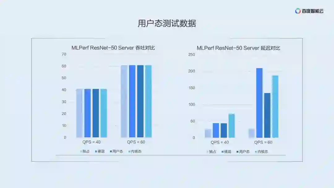 下图是我们在公开测试集 MLPerf 上选择典型模型 ResNet-50 Server 场景下的数据对比。图中的柱子从左至右依次表示独占、裸混、用户态隔离、内核态隔离下的性能。
