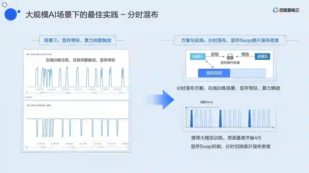 这里以在线训练为例。我们知道很多模型需要根据用户每日甚至每时的数据进行在线更新,例如推荐模型,这就需要用到在线训练。和吞吐实时打满的离线训练不同,在线训练需要积累一批数据后触发一次训练。百度内部,典型的模式可能是 15 分钟到达一批数据,但真正的训练时间只有 2 到 3 分钟,剩余的时间里这个训练进程就常驻显存等在那里,直至下一批数据从上游抵达。在此期间,利用率长期为 0,造成了大量的资源浪费。