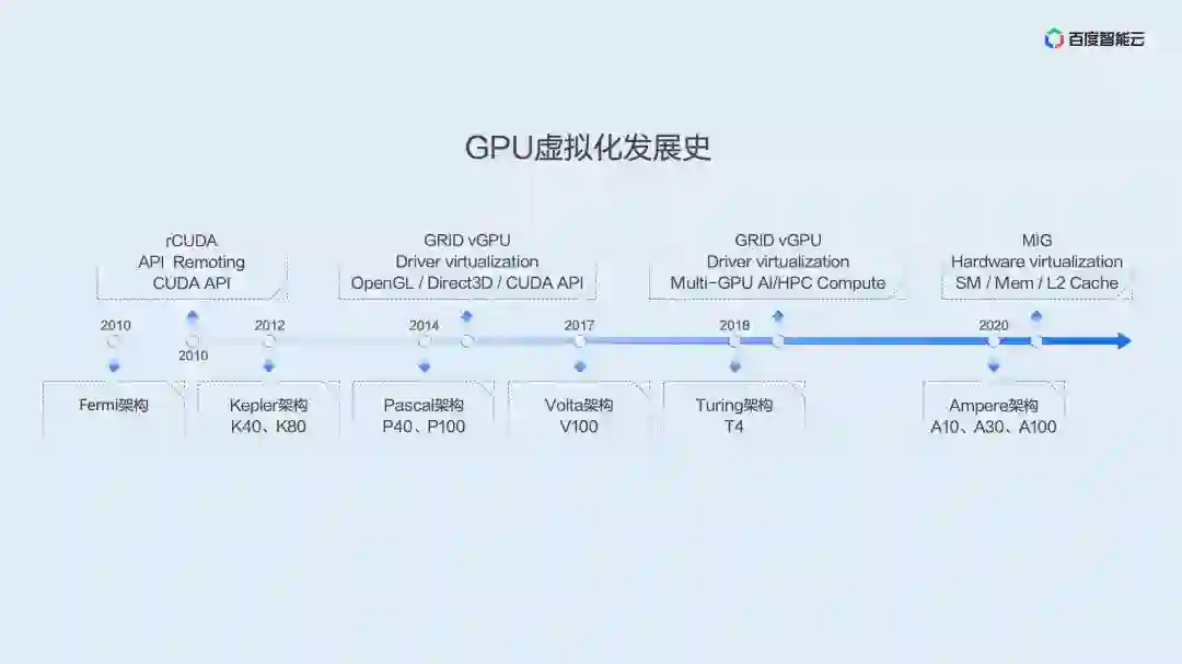 随后的 Pascal 架构、Volta 架构、Turing 架构性能有了飞速提升,这时虚拟化的需求日益显著起来。我们看到,最早从 Kepler 架构,NV 官方提供了 GRID vGPU 虚拟化方案,最开始主要是面向图形渲染和远程桌面场景。在 2019 年前后,针对 AI 和高性能计算场景也提供了解决方案。但这些方案都是基于虚机的,在 AI 场景中很少使用。
