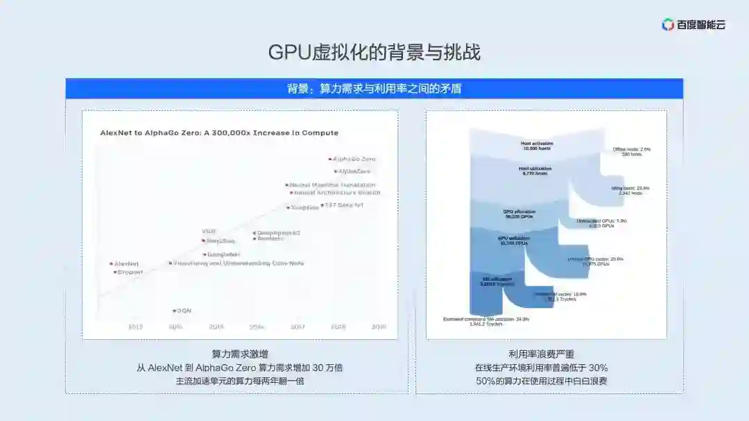 下面这张图片的左右两部分,在不同场合下已经多次展示过,放到这里主要想强调算力需求 —— 硬件算力的指数型增长,与真实应用场景中利用率偏低资源浪费之间的矛盾。