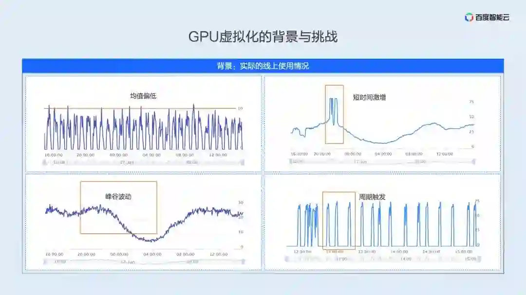 均值偏低型:如左上图,为一个真实的在线推理业务,由于模型特点和服务 SLA 的限制,GPU 的峰值利用率只有 10%,平均利用率会更低。