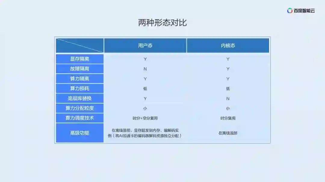 故障隔离方面,内核态较用户态有优势,而且内核态不需要对底层库进行替换。用户态算力调度采用时分加空分复用,内核态采用的时分复用。用户态高级功能包括在离线混部,显存超发到内存、编解码实例(将 AI 加速卡的编码跟解码资源独立分配),内核态我们也支持在离线混部等。
