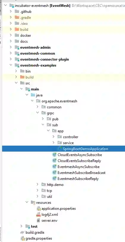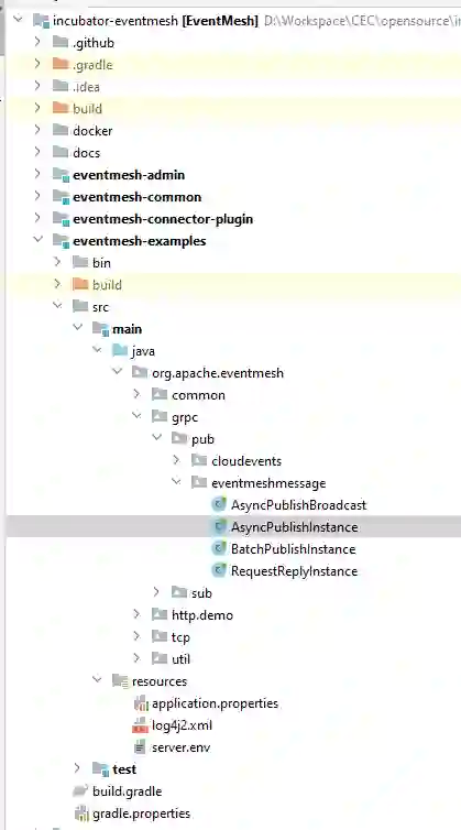 第二个文档介绍如何使用EventMesh SDK开发应用生产和消费事件,包含了TCP、HTTP和gRPC三部分。EventMesh工程项目里带有客户端的代码样例 (eventmesh-example),包括了gRPC Event Publisher、Event Subscriber的代码。比如,我们可以把EventMesh工程项目导入Java IDE里(比如Intellij IDEA)。按照以下步骤启动gRPC Event Publisher and Subscriber。