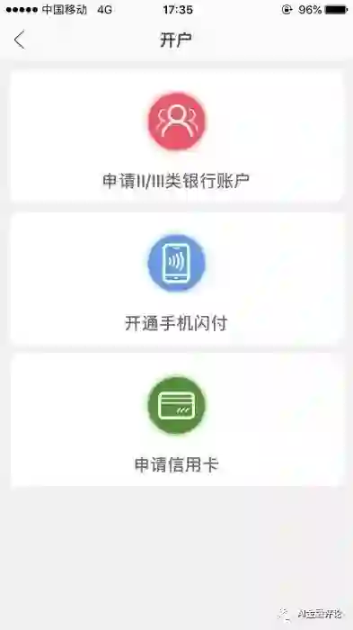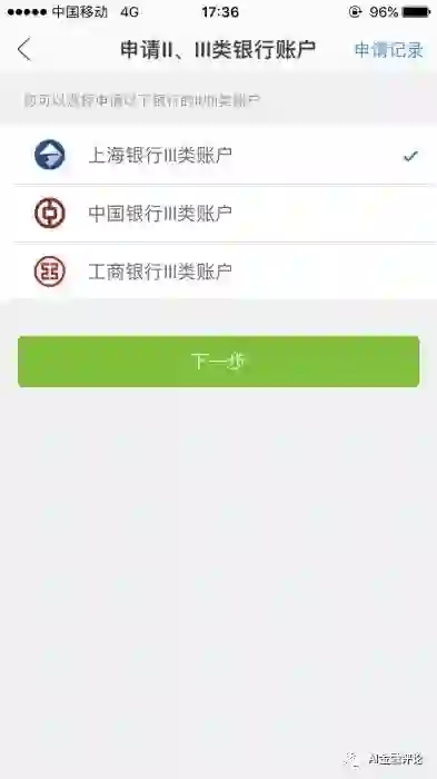 特别需要注意的是,在云闪付APP中,AI金融评论发现其还提供了“开户”功能,在其中用户能够申请Ⅱ、Ⅲ类账户,在移动端即可实现开户和进行应用。并且,AI金融评论绑定的是一张农行卡,在试用过程中发现能够申请上海银行、工商银行和中国银行的Ⅲ类账户,说明作为一款银行业统一APP,云闪付能够让用户在可以没有所申请银行的实体卡的前提下,实现移动端跨行开户。