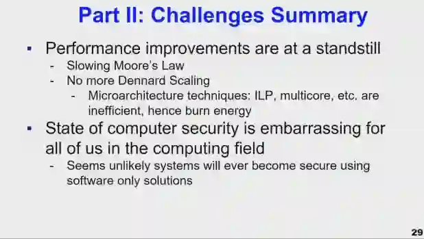 所以,由于当前摩尔定律减缓,Dennard定律也被终结,微体系结构指令层并行,多核等技术的低能效,计算机安全状态也让人尴尬,而又似乎不太可能用纯软件方法保证其安全,这些挑战将推动体系结构如何发展?