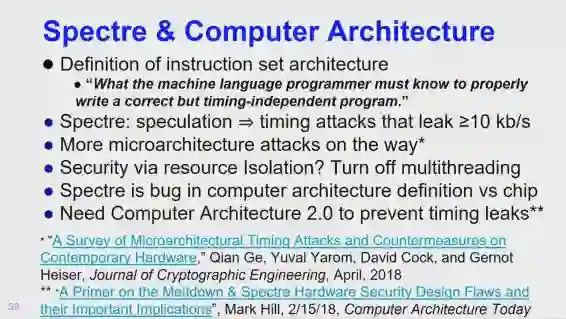 怎样才能使机器语言程序员写出正确的,且没有时间依赖性的程序?现在的体系结构面临着大量的“幽灵”猜测(时序攻击,大于10kb/s),将来也会有更多的微架构式攻击,我们是通过资源隔离还是关闭多线程以保证安全?这需要新的体系架构具备防止时序泄露的能力。