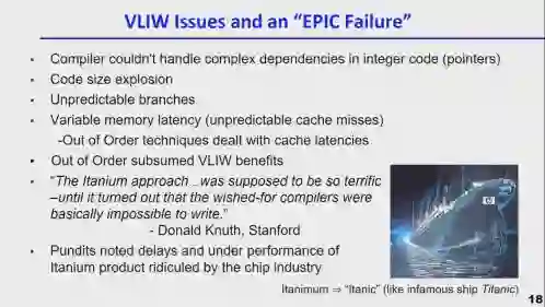 然而,“EPIC Failure”!由于编译器难以处理代码中的复杂依赖关系(指针),代码尺寸爆炸问题以及不可预知的分支与缓存未命中,尽管采用了乱序技术缓解了缓存延迟,但EPIC仍然失败了。专家们也指出Itanium产品的延迟和表现不佳,因此被芯片行业称为“Itanic”,如同Titanic。