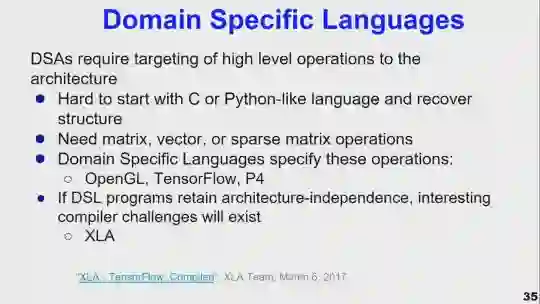 领域专用语言如OpenGL,TensorFlow等可对专用架构所需的常用操作进行总结,如矩阵、向量或稀疏向量的操作。然而,如果领域专用语言(DSL)程序与专用架构保持独立性,将导致编译上的困难。因此,针对通用应用任务,可以利用高级语言及其编译器实现在通用架构(如RISC)执行,而针对领域专用应用任务,则实现领域专用软硬件协同设计并以高级编译技术进行优化与匹配。