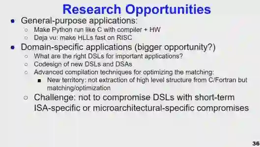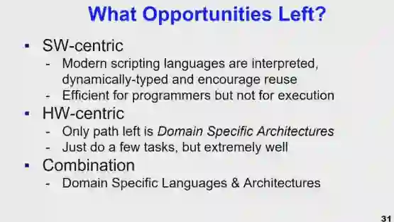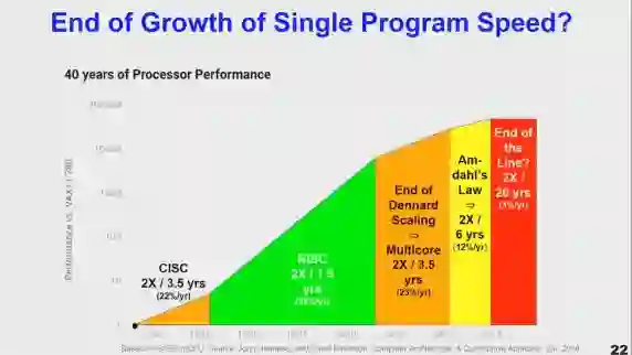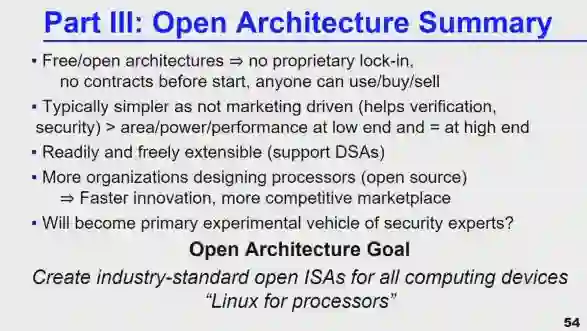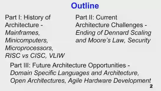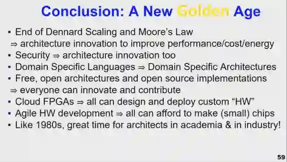 随着Dennard缩放定律与摩尔定律的终结,体系结构开始着重于提高性能,降低成本及功耗,计算机安全机制亟待革新,领域专用语言DSL催生了专用架构的产生,免费/开放的架构资源与开发套件,以及云FPGAs的开放使任何人都可定制硬件,硬件敏捷开发等诸多条件促成了体系结构的新黄金时代!