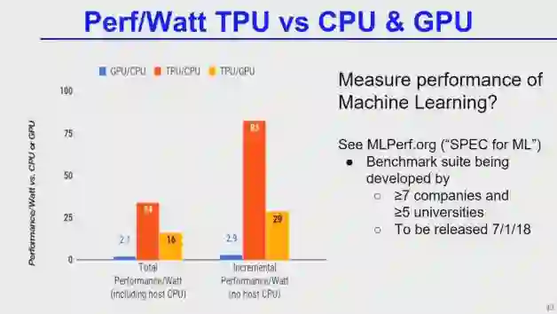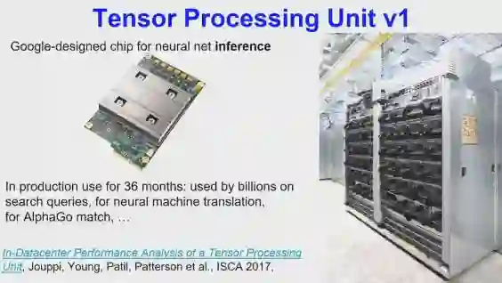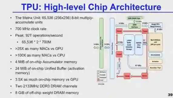 在机器学习领域,比较有代表性的专用架构中,Google设计的张量处理器(TPU v1,耗时36个月,数十亿),可用于神经网络运算、神经机器翻译、AlphaGo匹配等诸多任务,该专用处理器架构内部含有可完成65536(256x256)8bit规模乘累加单元的矩阵运算模块,4MB片上累加存储以及24MB单独缓存,其片上存储相比GPU多3.5倍,此外还包含了两个2GMHz左右的DDR3 DRAM通道,8GB片外DRAM存储,700M时钟频率,峰值操作可达到92T/s,其运算速率相比GPU快25倍以上,比CPU快100以上。