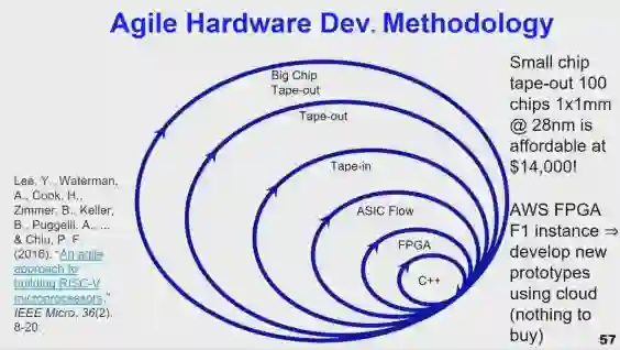 硬件敏捷设计,只需要很小的团队花较短的时间即可实现原型迭代。在敏捷硬件设计过程中,设计者可通过软件以高级语言对开发者的创新架构进行描述与仿真;然而所设计的模型在软件中并不能运行数十亿或更多的周期,开发者需借助FPGA工具进行验证,云FPGA的开放,使开发者无需购买验证硬件即可实现FPGA验证。经过前述步骤的迭代过程,即可准备流片,由于摩尔定律迟缓,当前的流片成本也逐渐降低,减轻了团队流片的成本压力。这种敏捷开发在伯克利试验过,一个团队在短短5年时间里即可制造10次芯片,使团队积累了丰富的芯片设计经验。