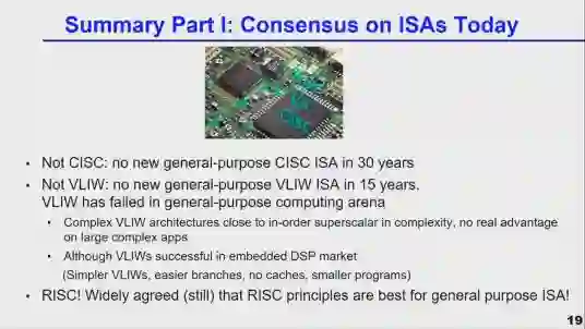 总结历史我们发现,CISC与VLIW分别在30和15年内未出现过新的通用ISA。尽管VLIWs在嵌入式DSP市场比较出色,但其在通用架构的竞技场中已败下阵来。如今在ISAs上我们达成了共识,RISC最终被大家认可是最普适的指令集!