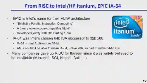 Intel自1994年起与惠普联合开发了一种针对Intel IA-64架构的纯64位微处理器Itanium /Itanium 2,其指令集是EPIC(二进制对象代码兼容的VLIW指令集),具有明确的并行指令计算,当时被认为是一个趋势,很多企业(包括Microsoft, SGI, Hitachi, Bull, …)也尝试放弃RISC而转向Itanium。