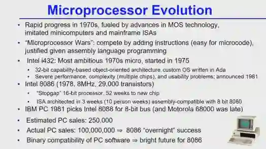 由于半导体技术推动,微程序设计在70年代发展迅速,期间出现了经典的Intel i432、8086以及8088处理器。8086采用16比特架构,可兼容8bit处理器8080。在8080后,Intel还研发过i432处理器,当时(1975)被认为是最具雄心的微处理器,它抛弃了继承x86的技术路线,基于32位功能,面向对象架构,拥有以Ada编写的自定义操作系统,然而该处理器存在一些性能、复杂性以及可用性上的问题,商业上失败告终。IBM在1981在其个人计算机(PC)采用了Intel 8088处理器,尽管该PC出色的销量导致了Intel 8086 “一夜成名”,但PC软件的兼容性也使得8086系列看清了未来发展方向。