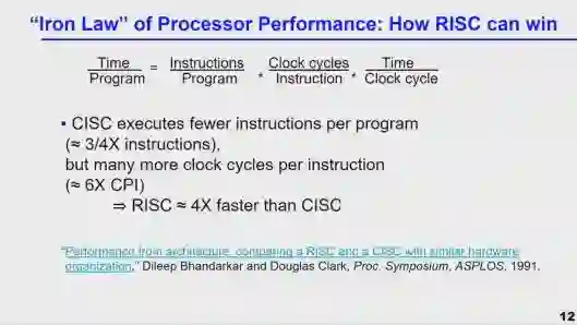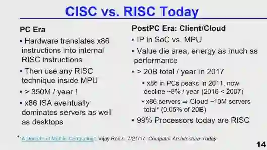 早在1991年,研究者证明,尽管CISC在运行中执行较少的指令,但其指令的平均执行周期较长,而RISC则在相同的硬件配置下比CISC的执行速度快4倍。在随后的PC 时代,许多硬件将x86指令转换为内部RISC指令,在MPU内使用RISC技术,这一策略使得x86指令集继续主导了服务器与PC领域,然而,后PC时代直到现在,已超过99%的处理器均使用RISC,其中大部分要归功于ARM。