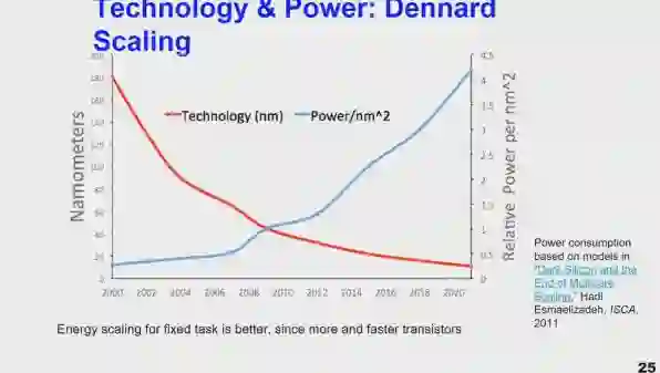 能耗成为架构设计的关键约束条件。Dennard缩放定律表示:晶体管面积的缩小使得其所消耗的电压以及电流会以差不多相同的比例缩小。但在晶体管越来越小时,量子隧穿效应开始介入,晶体管开始出现漏电现象,使得晶体管在更小的工艺时静态功耗反而增大,这导致了Dennard缩放定律终结。