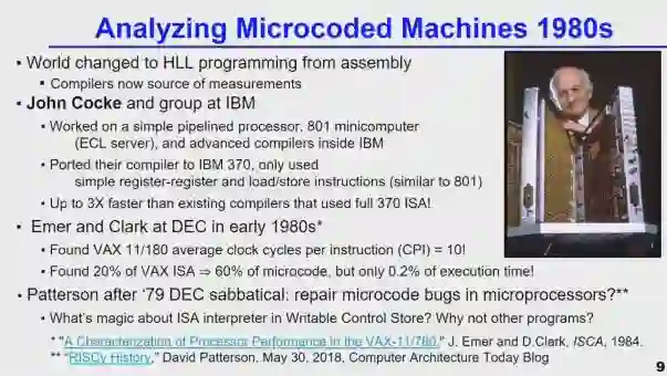 DEC公司的研究人员发现,在VAX11/180中,其指令平均执行时间(CPI)较长,微程序的60%由20%指令组成,但其执行时间约只占0.2%,同时,复杂指令集扩展也导致了微程序出现诸多漏洞。这些问题引发了Patterson对新指令集的思考,并创建了新的精简指令集RISC。