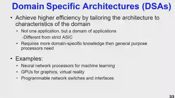 专用架构的设计:将硬件架构进行定制并使其具备特定领域应用特征,使该领域的一系列应用任务都能高效执行。相比通用架构,专用架构的设计需要设计者对专用领域知识更加了解。当前比较流行的专用架构包括:机器学习领域的神经网络处理器,图形图像、虚拟现实领域的图像处理器(GPUs),可编程网络交换机及接口等。
