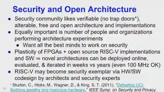 安全问题一直为人们关注,过去人们想到很多方法维持系统安全,但多数不好用或开销过大而逐渐被淘汰。早期人们发现提出了硬件抵抗攻击的方案,但其验证难度较大,且还面临着内核与微内核规模爆炸问题,这些方案逐渐被人们放弃。当前几乎所有的软件都必须构建安全系统,但仍存在软件缺陷,所以硬件必须对安全领域有所作为。