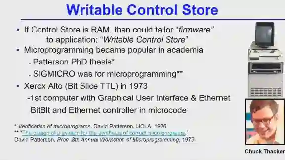 由于逻辑运算、RAM与ROM均以晶体管实现,半导体RAM与ROM具有类似的速度,摩尔定律以及RAM对微程序的重写能力,促使了复杂指令集(CISC)的诞生。同时,微程序设计在学术界非常流行,最著名的可写控制存储计算机是1973年由Chuck Thacker(2009年图灵奖获得者)领导设计的Xerox Alto,Xerox Alto是第一台现代个人计算机,首次使用了图形用户界面以及具有以太网功能,其像素转换与以太网控制器采用了微编码技术。