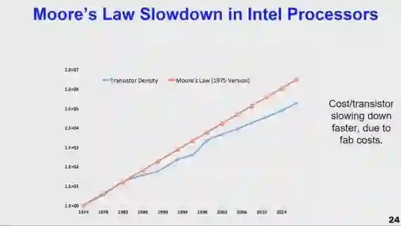 晶体管尺寸缩小速度放缓,摩尔定律即将迎来终结。摩尔定律表示:在成本不变的情况下,集成电路上可容纳的晶体管数目按照一定时间呈指数级增长。不过后来随着硅工艺发展趋于其物理瓶颈,摩尔定律开始滞缓,从1965年的一年翻一倍,1975年改为2年翻一倍,1997年又改为18个月翻一倍,最终,摩尔本人在2003年指出:摩尔定律还能坚持十年。