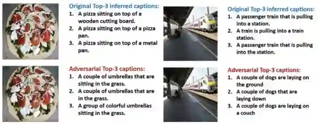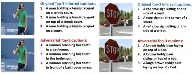 与之前的相关研究不同的是,这一篇由来自麻省理工学院、加州大学戴维斯分校、IBM Research 和腾讯 AI Lab 的学者撰写的论文将对抗样本攻击延伸到了图像标注(image captioning)系统领域。图像标注标系统能从给定的图像中自动生成一段描述性文字。这一技术還能够帮助视觉上有障碍的人了解新闻、社交网站等媒体上的图像的含义。图像标注系统中的对抗样本同样有着严重的危害。想象一下,你的图片经过肉眼无法察觉的改造后,自动标注系统可能会对这张图片生成任何无关、完全相反甚至恶意的描述。