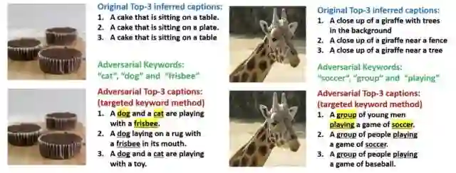 论文中关键词目标攻击的示例。左图中给定「猫」、「狗」和「飞盘」三个关键词,生成了一个蛋糕图片的对抗样本使得 Show-and-Tell 模型给出了「一只狗和一只猫正在玩飞盘。」的标注。右图中给定「足球」、「群」和「玩」三个关键词,生成了一个长颈鹿图片的对抗样本使得 Show-and-Tell 模型给出了「一群年轻人在玩一个足球的游戏。」的标注。