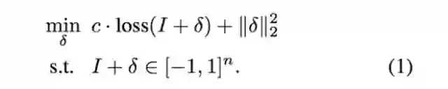 给定一张图片 I,文中作者将寻找对抗扰动构造为一个由损失函数 loss 和 2-范数构成的优化问题: