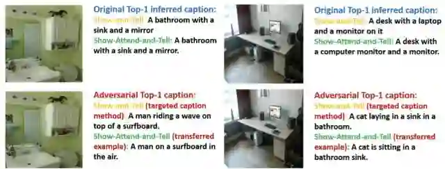 在 Show-and-Tell 模型上生成的对抗样本可以迁移到 Show-Attend-and-Tell 模型上,左图中 Show-and-Tell 模型将一个关于浴室的对抗样本标注为「一名男子在冲浪板上冲浪。」,而同一个对抗样本在 Show-Attend-and-Tell 上的标注结果为「一名男子在空中的冲浪板上。」。右图中 Show-and-Tell 模型将一个关于书桌的对抗样本标注为「一只猫躺在浴室里的盥洗台里。」,而同一个对抗样本在 Show-Attend-and-Tell 上的标注结果为「一只猫坐在浴室盥洗台里。」