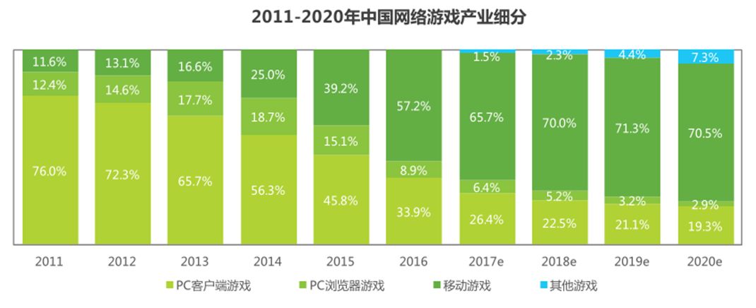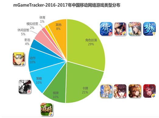 来看一张2016-2017年艾瑞发布的游戏品类市场份额。