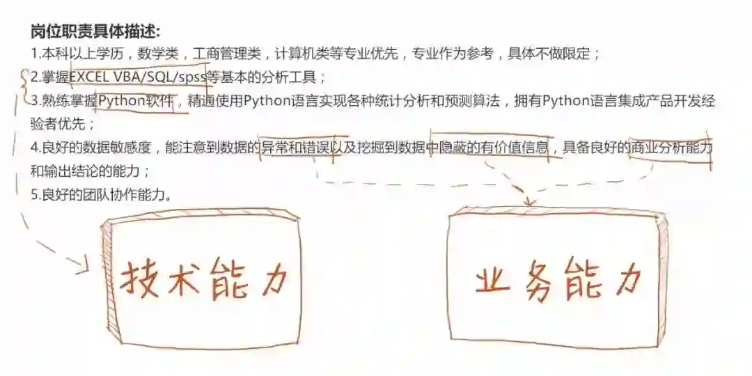 第一是技术能力,比如这篇招聘广告中提到的EXCEL VBA/SQL/spss还有Python。