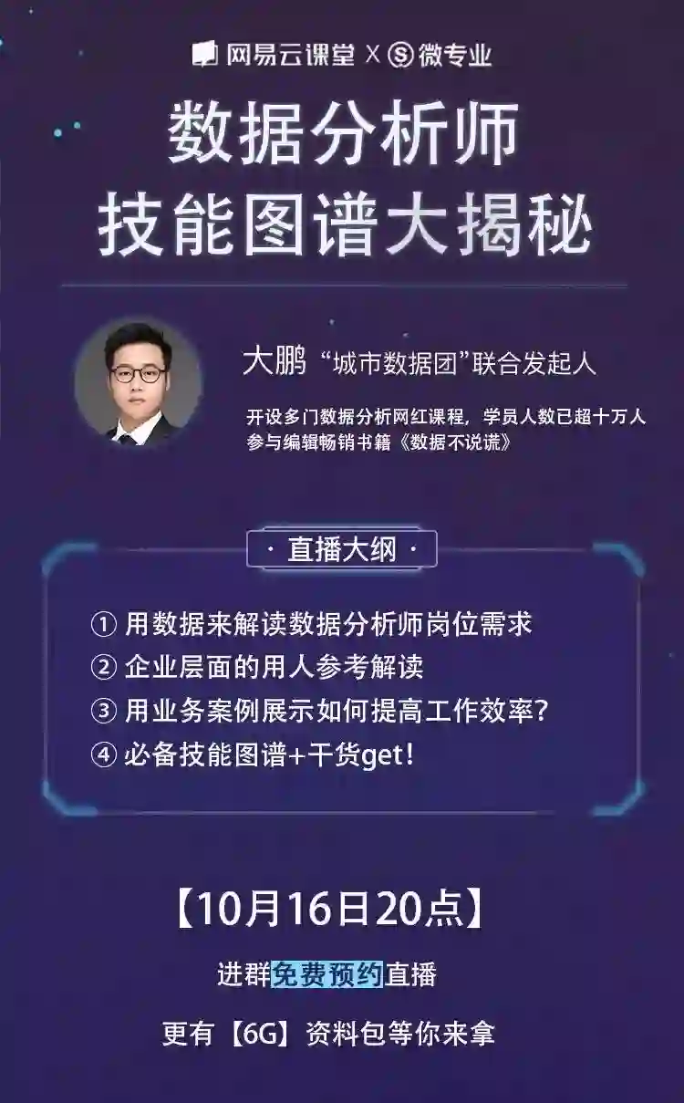 大鹏将详细解读Python数据分析师的岗位需求和技能学习建议,欢迎来听: