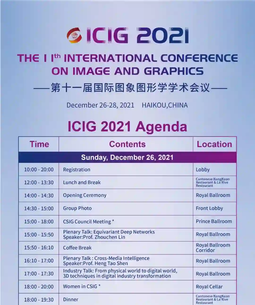 第十一届国际图象图形学学术会议(ICIG 2021)将于2021年12月26-28日在海口举行,会议由中国图象图形学学会主办,海南大学承办,南京理工大学协办。会议聚焦图像、视频及图形处理领域的创新技术,旨在促进创新、创业和交流,诚邀国内外图像图形领域的科技人员参会交流。
