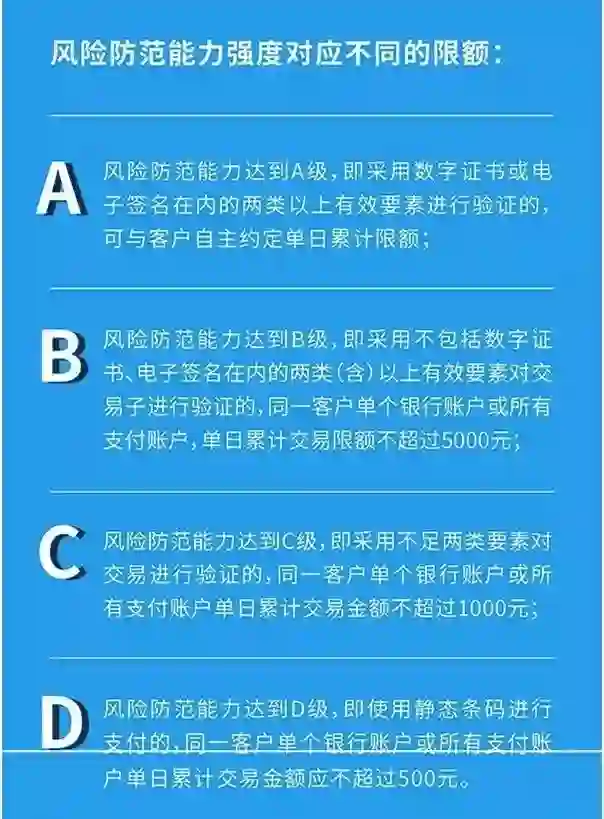 李子川补充道:超过500元的动态条码支付,A级一般要求有数字证书以及电子签名等要素验证方式;B级要求除数字证书和电子签名这两种方式以外,至少含有两类以上的其他要素方式,不同的级别要求程度不同。而静态码支付500元的限额没有要素验证,它是指用户单个银行账户或者所有支付账户累积的限额。