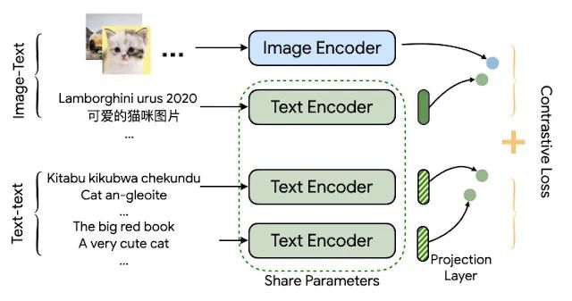 这两项任务共享文本编码器模块。该模型从图像 - 文本数据中学习图像和文本之间的联系,以及从翻译对中学习数百种不同语言的表示。其思想是,共享编码器将把从高资源语言中学到的图像 - 文本关联转移到低资源语言。